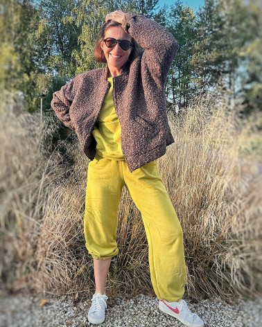 The trousers have a comfortable wide elastic band at the waist, which allows for height adjustment, and pockets on the sides.