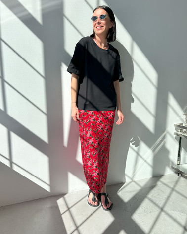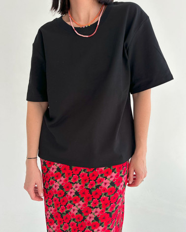 Damski t-shirt uszyty ze 100 % dzianiny bawełnianej w pudełkowej formie w kolorze czarnym.