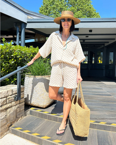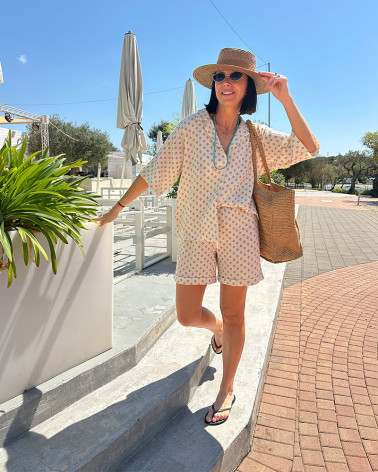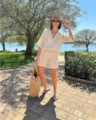 Spodnie delikatnie się rozszerzają ku dołowi, wykończone zawiniętym mankietem. Tkanina to muślin z delikatnym tłoczonym wzorem.