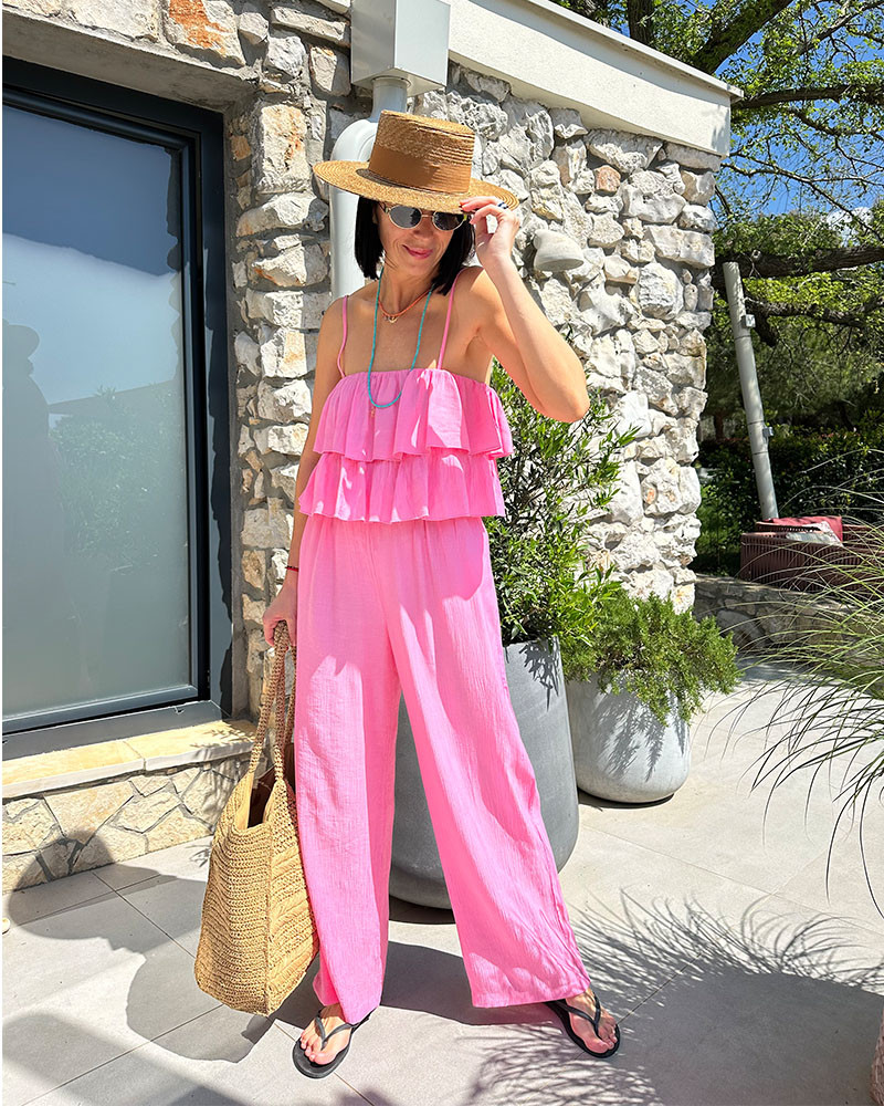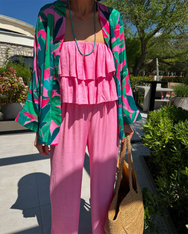 Poznaj Naszą nowość elegancki kombinezon w różowym kolorze, wykonany z wysokiej jakości włoskiej wiskozy kreszowanej.