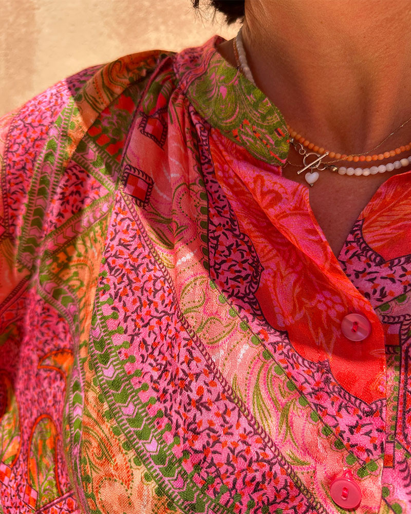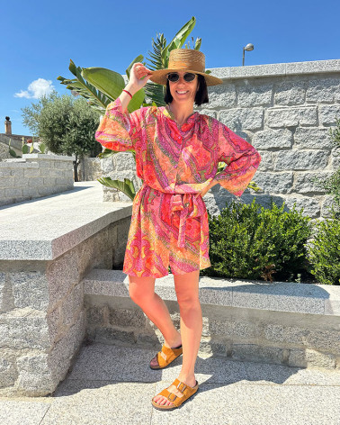 Wyrazista, letnia sukienka w stylu boho o luźnym kroju i intensywnym, wielobarwnym wzorze.