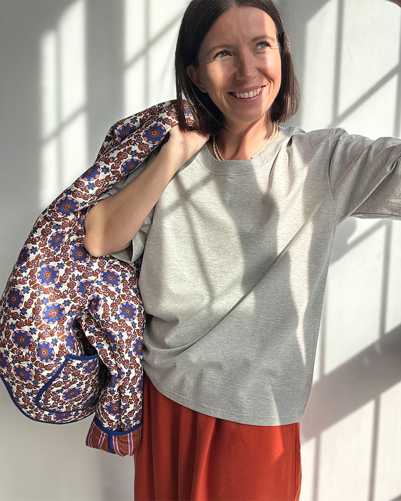 Szerszy ściągacz przy dekolcie zrobiony z grubszej dzianiny ściągaczowej. Wydłużone rękawy bluzki aby każda z nas czuła się bardziej komfortowo a przy okazji i modnie oraz postawiliśmy na trochę dłuższą formę.