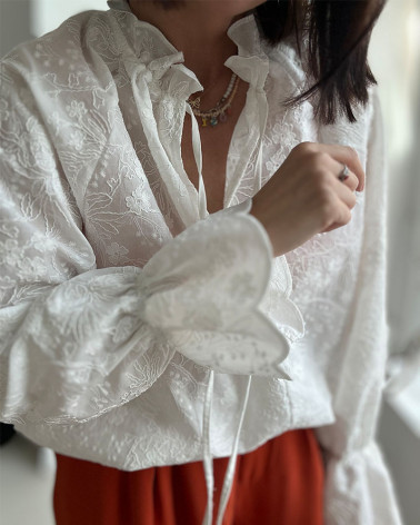 Koszula to haftowana delikatna najnowsza propozycja wykończona na górze jest stójka z delikatnym rozcięciem zawiązywana na cieniutkie troczki.