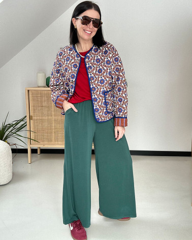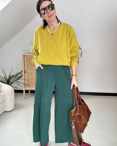 Delikatna guma w talii zapewnia wygodne dopasowanie, a praktyczne kieszenie dodają funkcjonalności. Nogawki subtelnie rozszerzają się ku dołowi, tworząc harmonijną, wydłużoną linię sylwetki. Miękka dzianina pięknie pracuje w ruchu, czyniąc spodnie idealnym wyborem zarówno do stylizacji domowych, jak i miejskich.