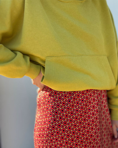 Uszyta z tkaniny o drobnym, geometrycznym wzorze w odcieniach czerwieni, musztardy i czerni, doskonale wpisuje się w styl retro i boho.