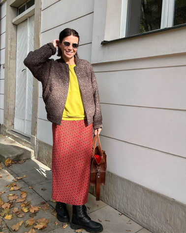 Spódnica świetnie wygląda zarówno z ciężkimi botkami i swetrem, jak i z lekką bluzką oraz sandałkami latem.